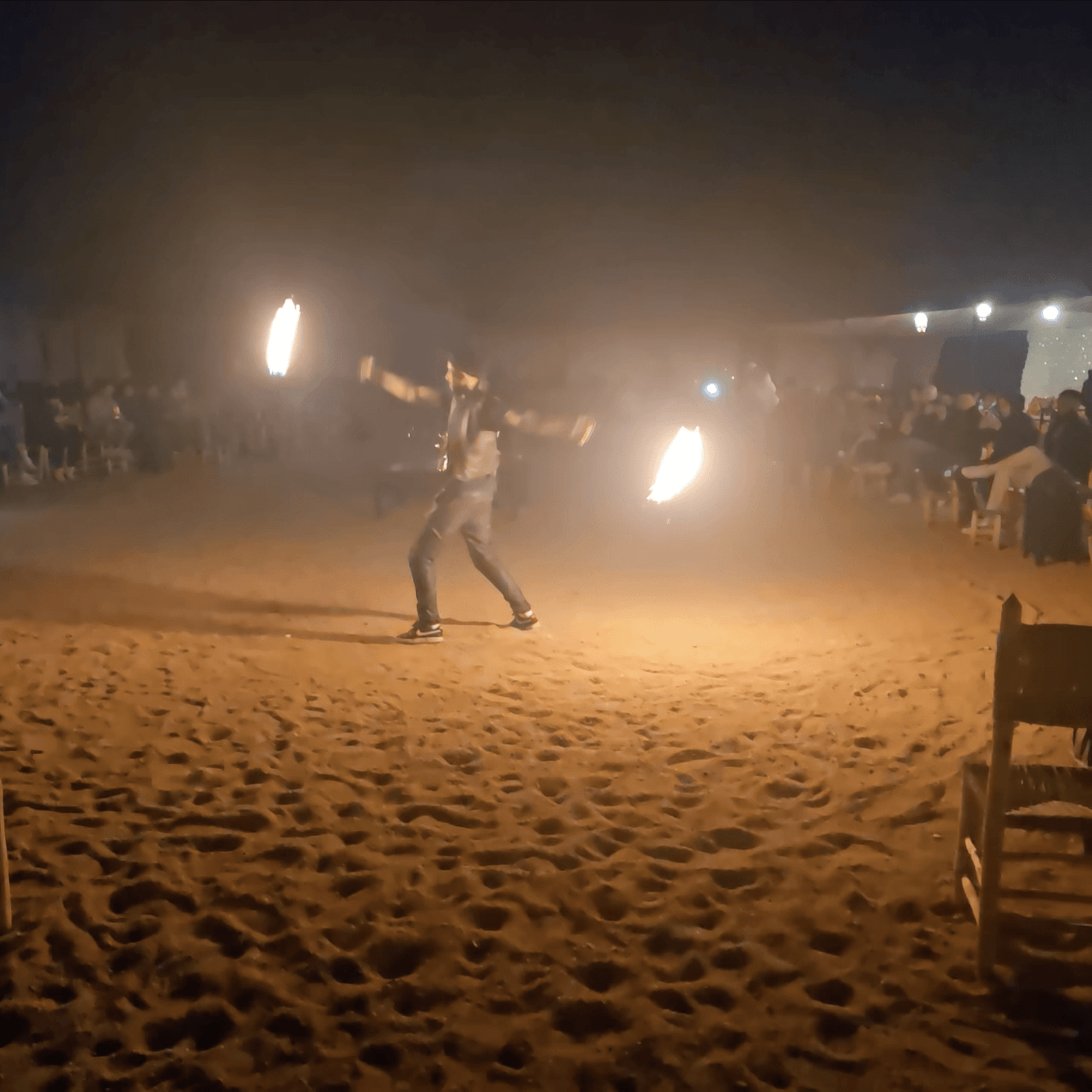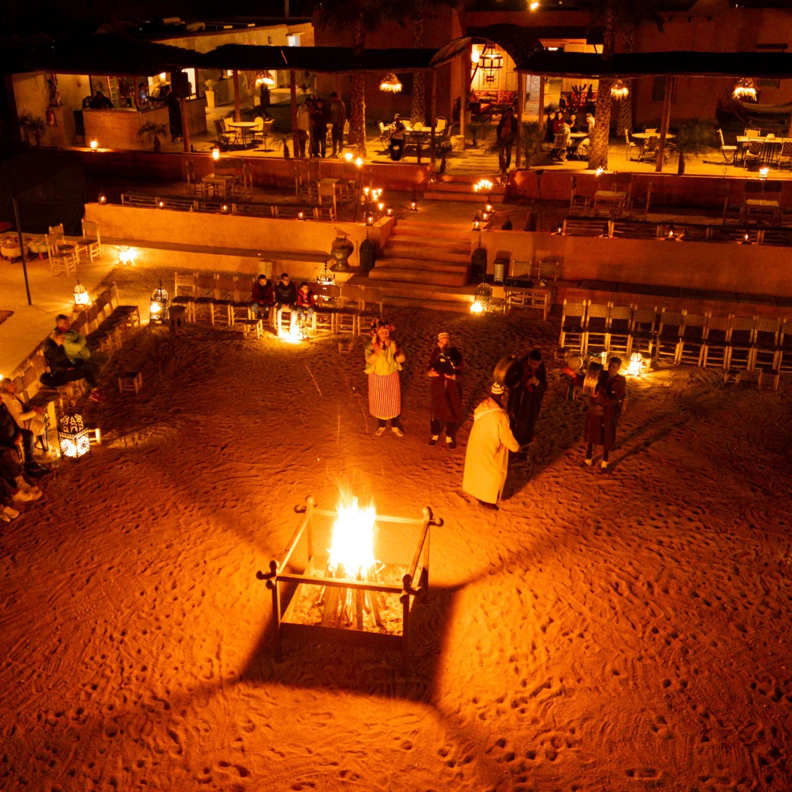 Nuestro espectáculo folclórico tradicional da vida al espíritu de Marruecos mientras saborea la auténtica cocina bajo el cielo estrellado. Los fascinantes bailarines de fuego crean un final inolvidable para su velada, con el anfiteatro natural del desierto como telón de fondo espectacular.