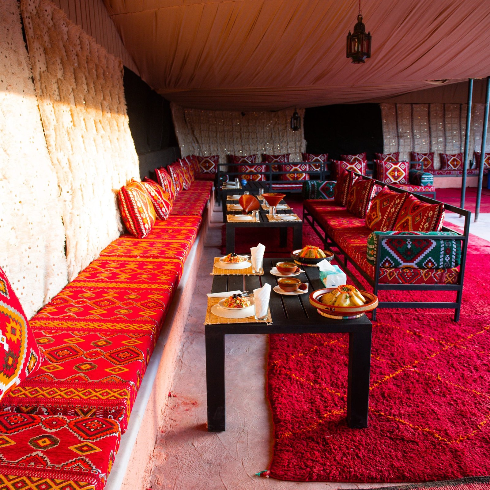 Llegada al campamento en el desierto para la ceremonia del té marroquí y fotografías del atardecer.